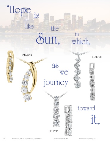 “Hope is like the Sun, which, in PD2052 PD1768 as we journey toward it, PD1595 20 Available in 14K, 18K, two-tone, 950 Platinum,& 950 Palladium. Call for orders: 718-247-4500 Live Chat: www.uniquesettings.com