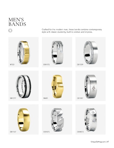 MEN’S BANDS Crafted for the modern man, these bands combine contemporary style with classic durability, built to endure and impress. M723 DB1172 DB1339 DB1277 M681 DB1057 DB1147 DB1075 DBM372 UniqueSettings.com | 47
